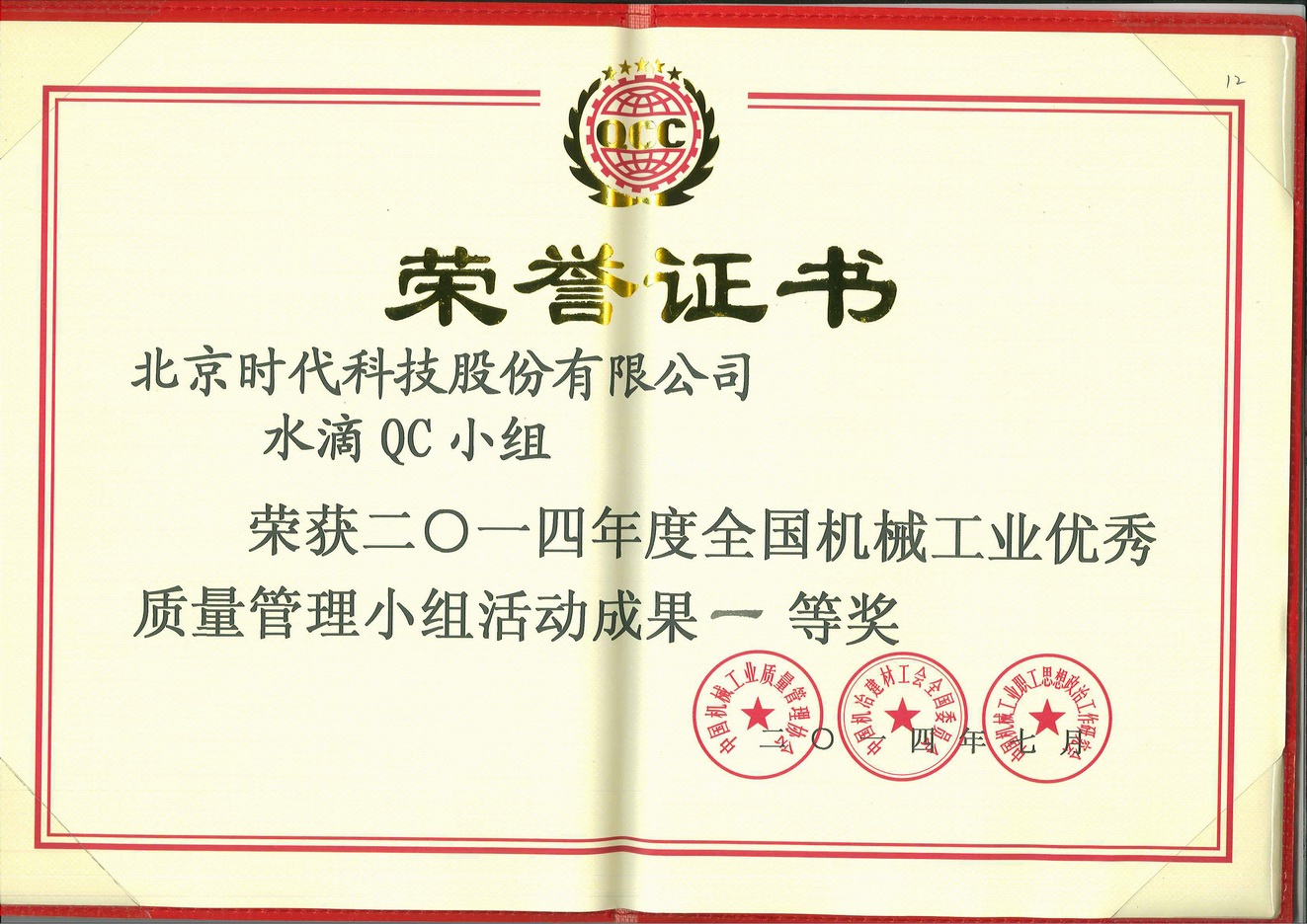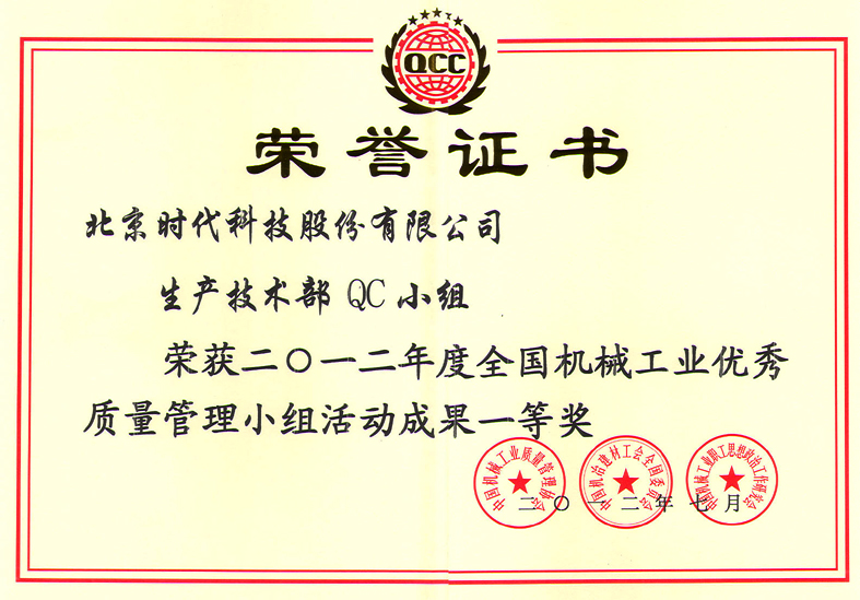 2014-08 2014年全國機械工業(yè)優(yōu)秀質(zhì)量管理小組獎 一等獎 中國機械工業(yè)質(zhì)量管理協(xié)會(huì )