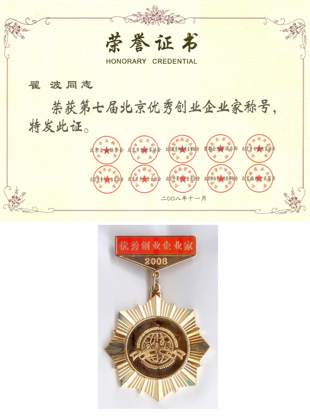 2008-11 第七屆北京優(yōu)秀創(chuàng )業(yè)企業(yè)家 北京企業(yè)聯(lián)合會(huì )、北京企業(yè)家協(xié)會(huì )