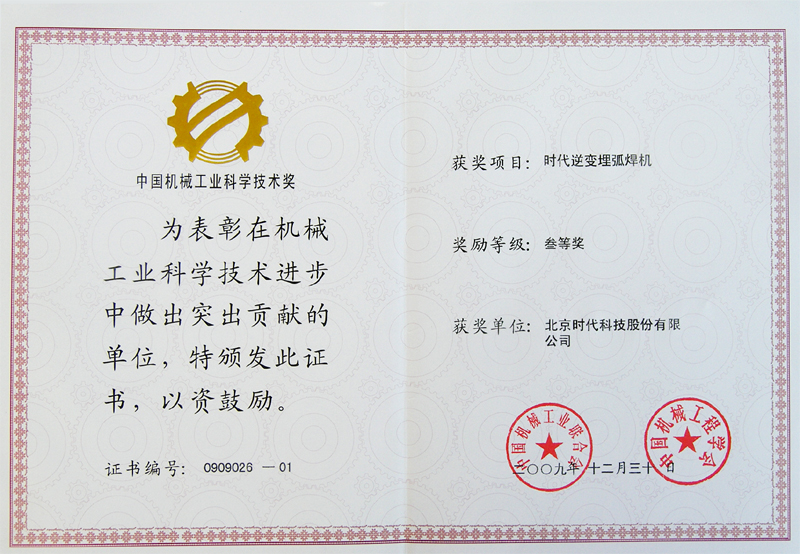 2009-12 中國機械工業(yè)科學(xué)技術(shù)獎 時(shí)代逆變埋弧焊機 中國機械工程學(xué)會(huì )