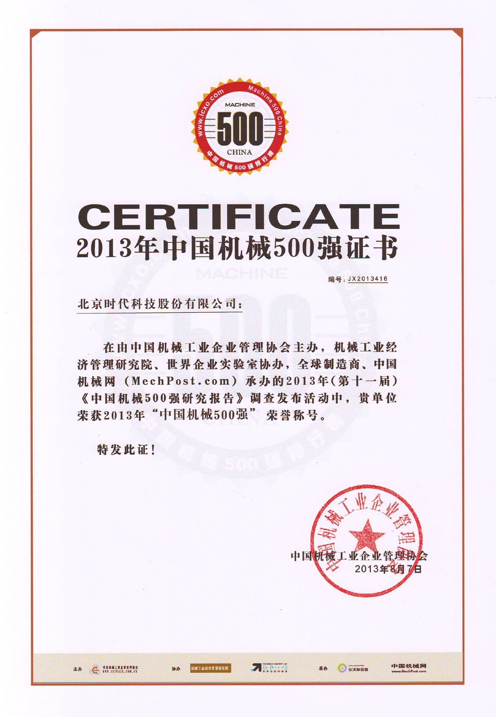 2013-08 中國機械500強 證書(shū) 中國機械工業(yè)企業(yè)管理協(xié)會(huì )