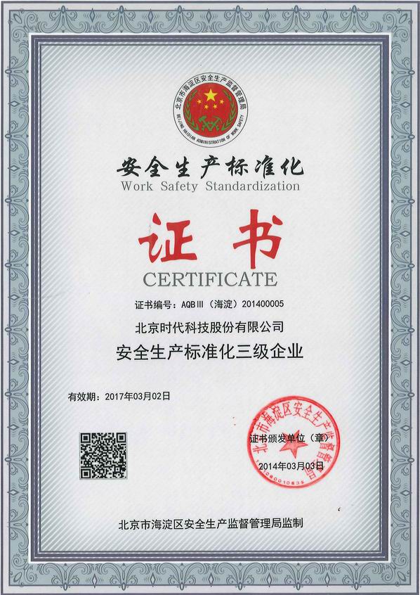 2014-04 安全生產(chǎn)標準化證書(shū) 北京市海淀區安全生產(chǎn)監督管理局