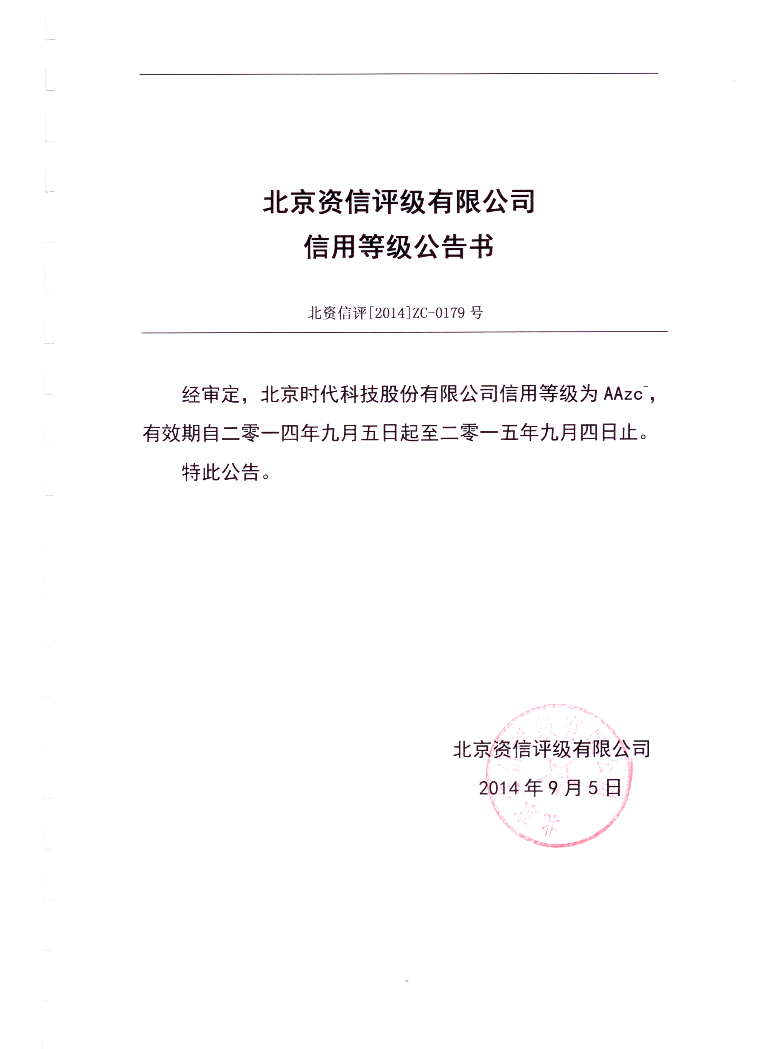 2014-11 北京時(shí)代科技股份有限公司信用等級公告書(shū) 北京資信評級有限公司