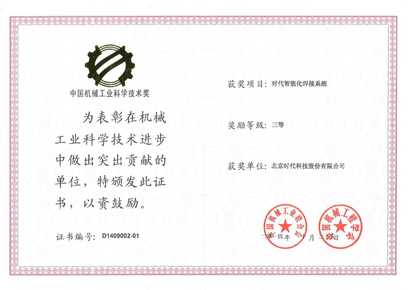 2014-12 中國機械工業(yè)科學(xué)技術(shù)獎 時(shí)代智能化焊接系統 中國機械工程學(xué)會(huì )