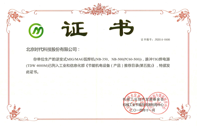 2015-01 工業(yè)和信息部《節能機電設備推薦目錄》證書(shū) 機械工業(yè)技術(shù)發(fā)展基金會(huì )