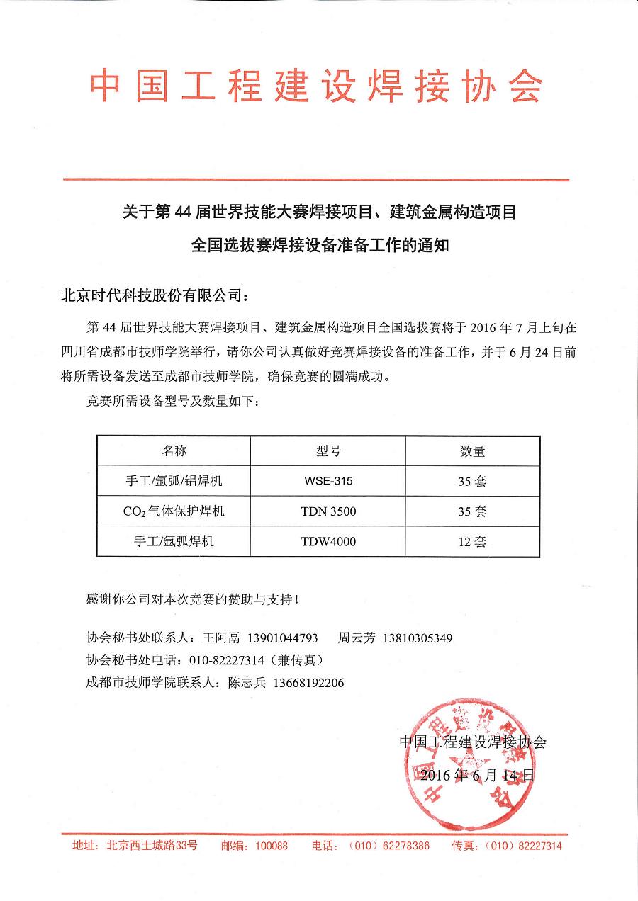 2016-06 第44屆世界技能大賽焊接項目、建筑金屬構造項目全國選拔賽唯一指定用機 中國工程建設焊接協(xié)會(huì )